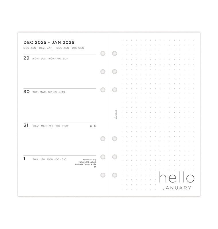 Verleihen Sie Ihren Plänen Flügel mit unserer Minimal Kalendereinlage. Diese moderne Personal-Einlage bietet ein horizontales Layout für die Wochenansicht in ganz frischer Ausführung für Organisation in allen Varianten. Die "Belongs to"- Seite, sorgt für eine persönliche Note. Die Übersichten des aktuellen und des nächsten Jahres sind enthalten, um auch bereits im Voraus planen zu können, während die Monatsübersichten jeweils den neuen Monat einleiten. Entdecken Sie den Abschnitt "Big Plans" mit punktkarierter Ausführung für monatliche Ziele. Am Ende des Kalenders finden Sie zusätzlich punktkarierte und linierte Seiten, perfekt für Notizen und Kritzeleien. Multilingual. Füllhalterfreundliches Papier.
