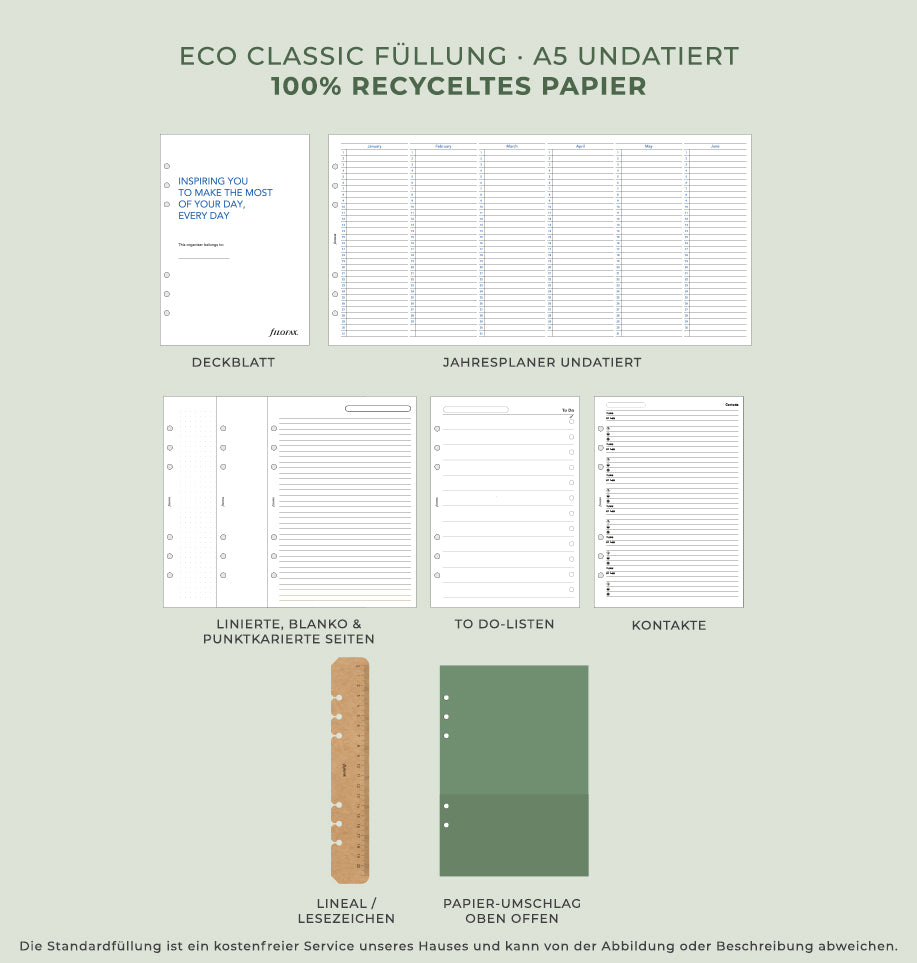 Entschädigungen für verspätete Lieferungen sind ausgeschlossen. Filofax ist auch nicht verantwortlich für Verspätungen durch die Zollabfertigung bei Lieferungen außerhalb der Schweiz.